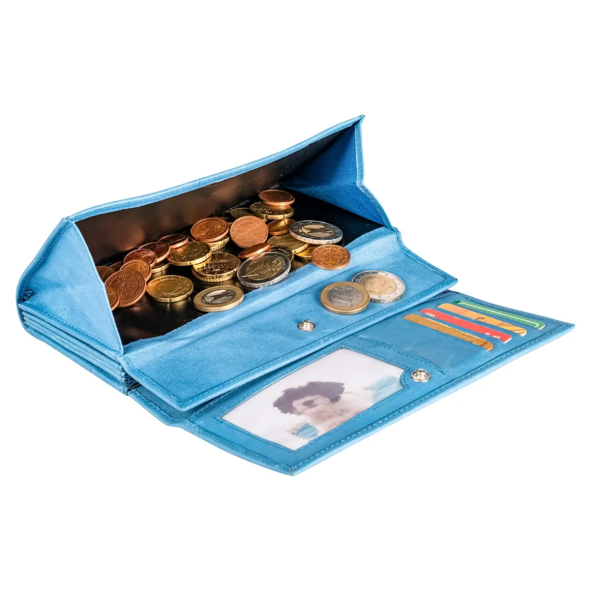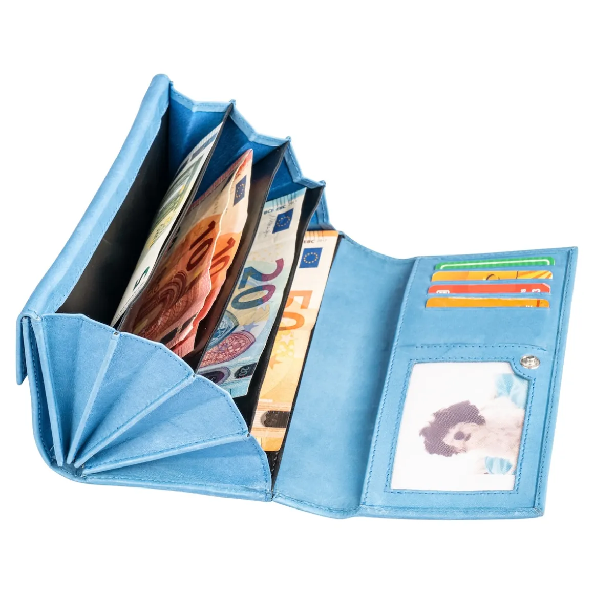 Diese Echtleder-Geldbörse mit Hibiskusblüten-Prägung bietet Ihnen ausreichend Stauraum für Geld und Papiere: Sie bietet Ihnen ein großes Münzfach mit Druckknopf, 6 Fächer für Banknoten, 4 Kartenfächer, ein Sichtfach für den Ausweis und ein Steckfach auf der Rückseite. Praktisch: Dank des Breitformats hat auch Ihr Handy perfekt darin Platz.