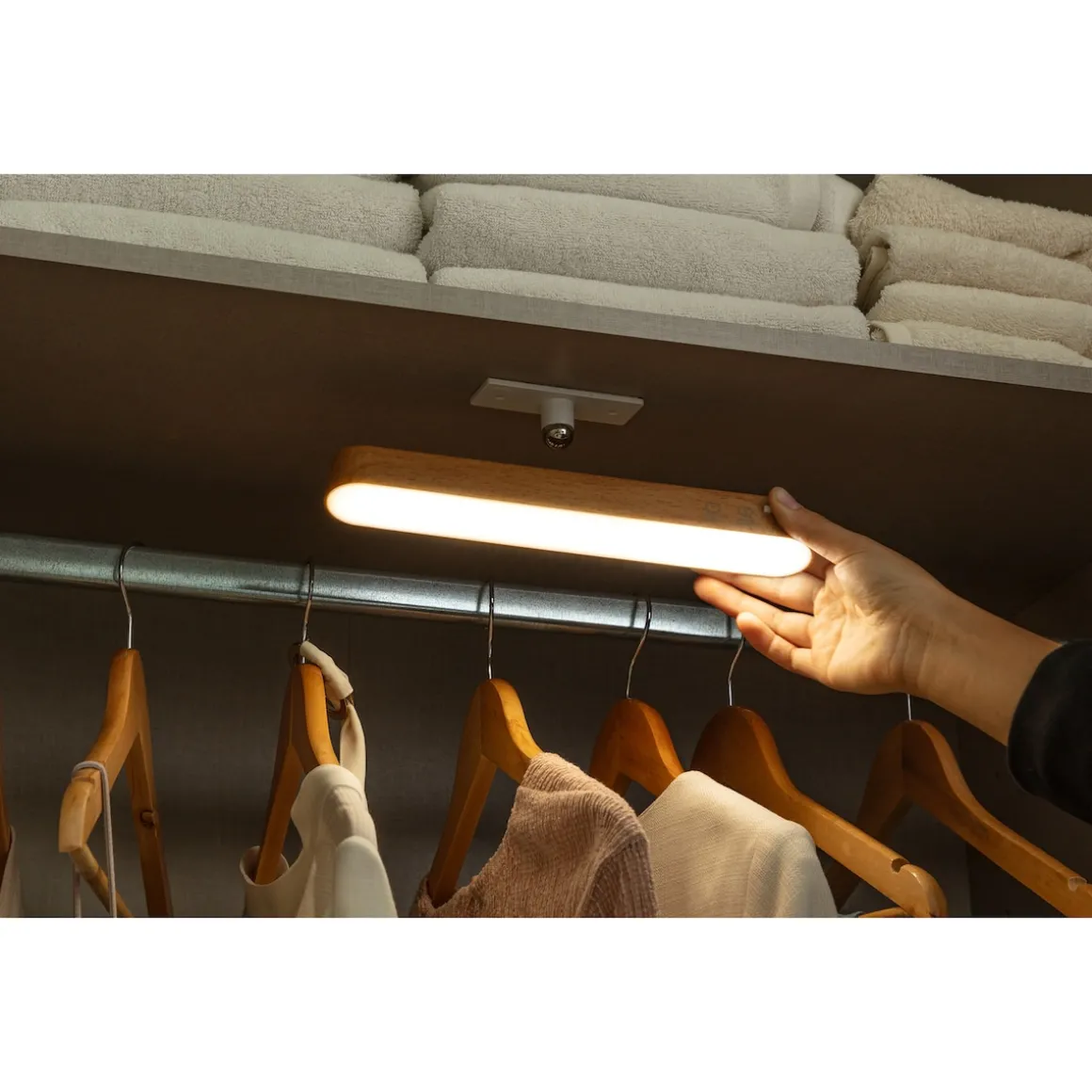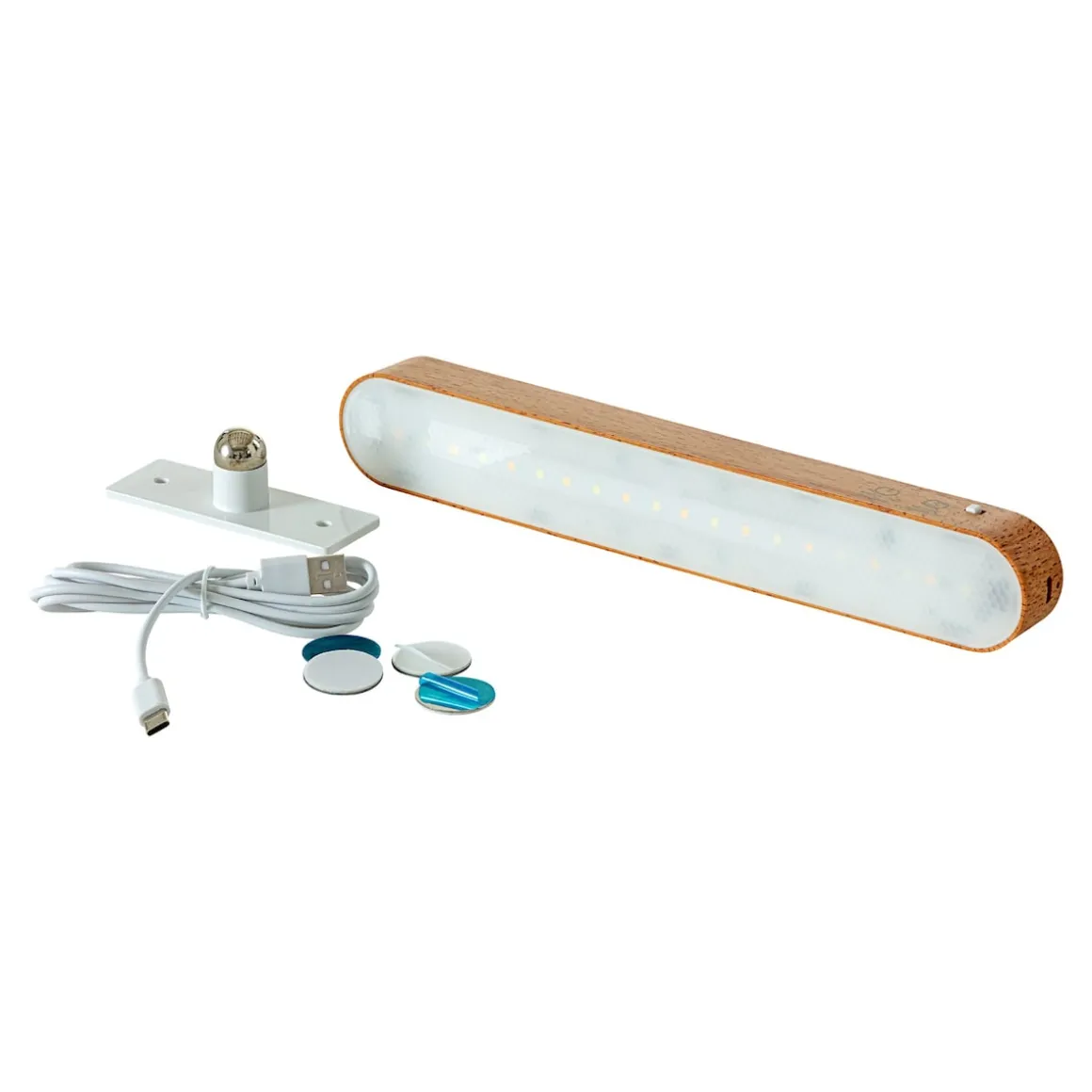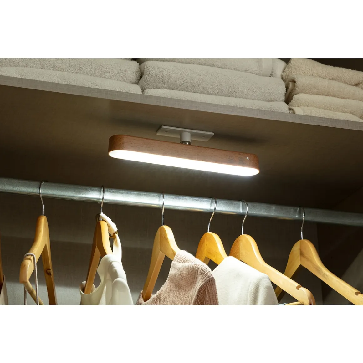 Kein mühsames Tasten mehr, denn diese Schrankleuchte in edler Holzoptik spendet Licht, wo Sie es brauchen! Sie lässt sich dank Klebepunkten und Magnet mühelos und sicher befestigen. Bei Bedarf ist sie zudem als Handleuchte sofort einsatzbereit. Mit Ein-/Ausschalter. Inkl. USB-Ladekabel.