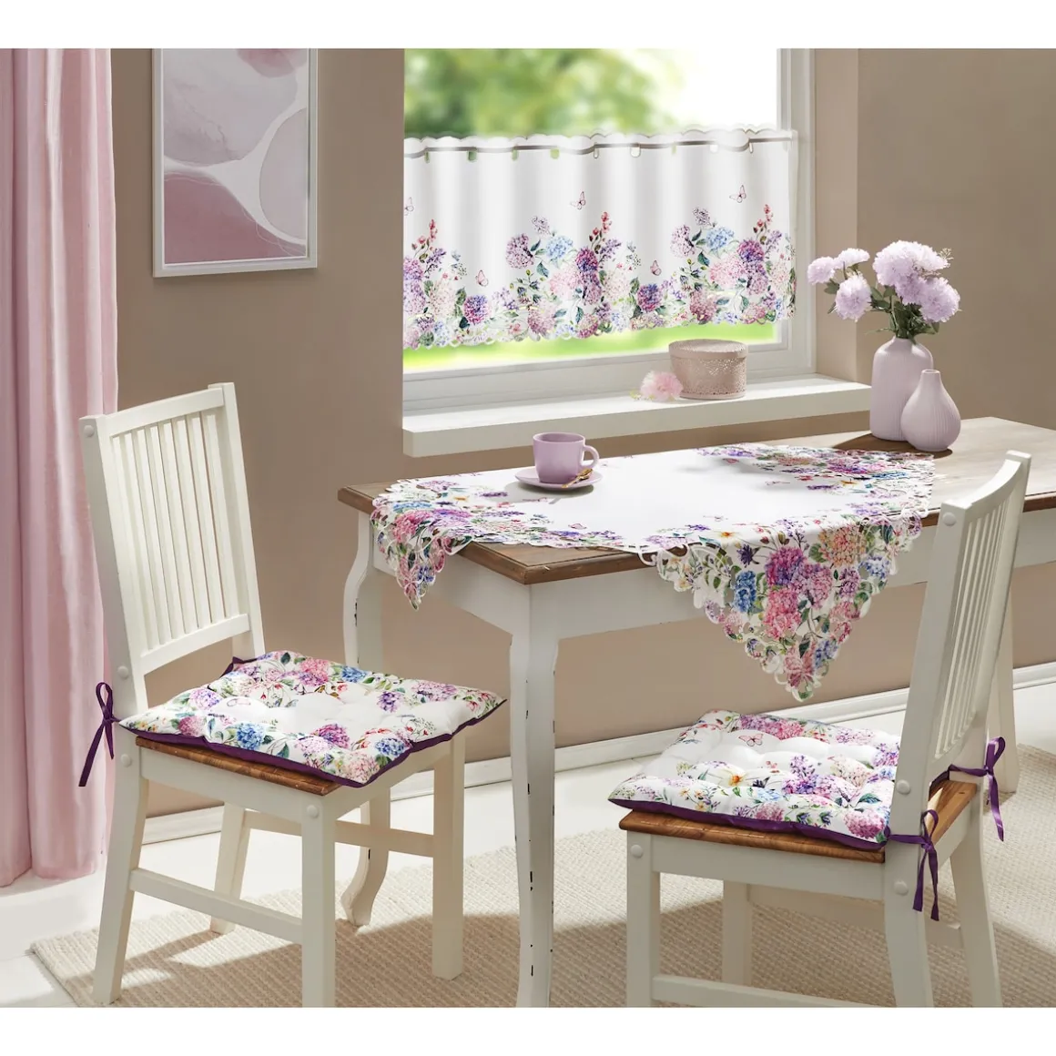 Diese Mitteldecke bringt Eleganz auf Ihren Tisch. Das kunstvolle Design mit Schmetterlingen und Hortensien wird durch goldene Umrandungen veredelt. Halb bestickt, halb geprintet – ein dekoratives Highlight für besondere Anlässe oder stilvolle Alltagsmomente.