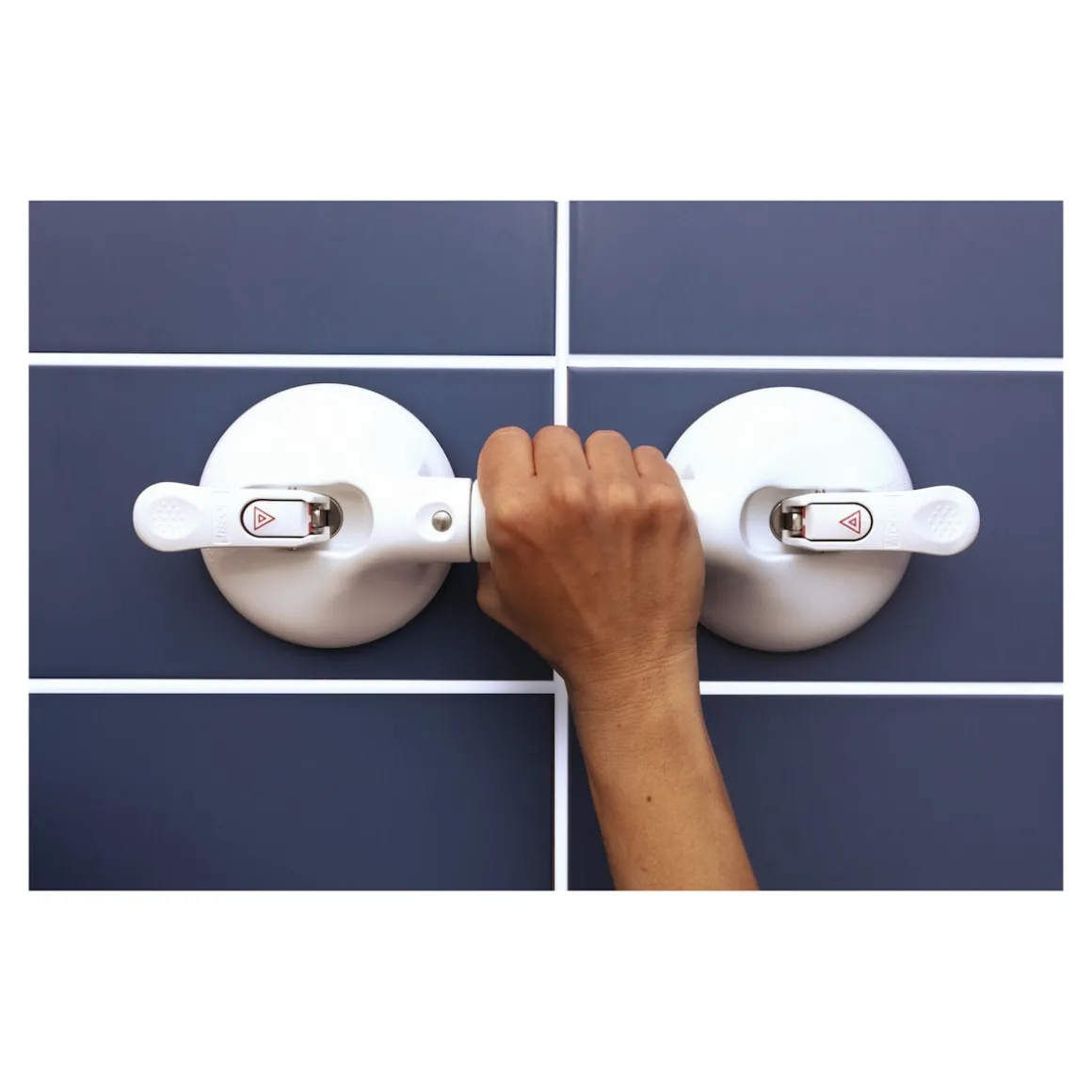 Ist die Warn-Wippe im Hebel versenkt, stimmt die Haftkraft und der Griff ist voll belastbar. Fährt die Warn-Wippe aus und der rote Wippenrand wird sichtbar, muss der Mobelisauger gelöst und erneut befestigt werden. Die extrem starken Vakuum-Teller sind schnell angebracht und auch wieder gelöst.