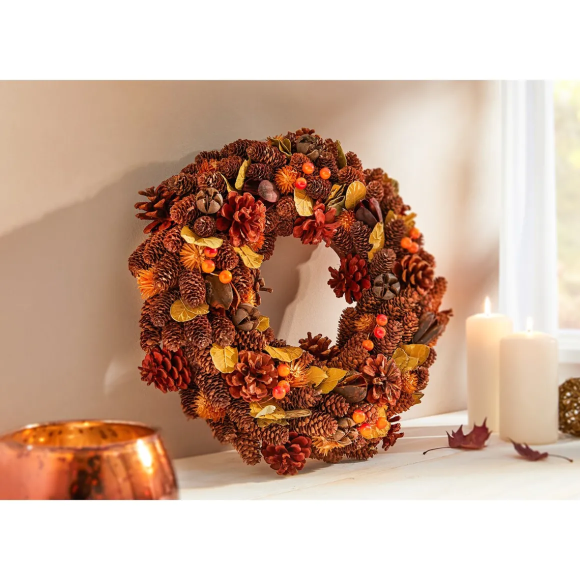 Entdecken Sie die Schönheit des Waldes mit diesem bezaubernden Naturkranz. Geschmückt mit Beeren, Zapfen und Herbstblättern, verleiht er Ihrem Zuhause eine einladende Atmosphäre, die den Herbst in all seinen Facetten zum Ausdruck bringt. Perfekt als Türkranz oder als Mittelpunkt auf der herbstlich gedeckten Tafel. Mit echten Kiefernzapfen.