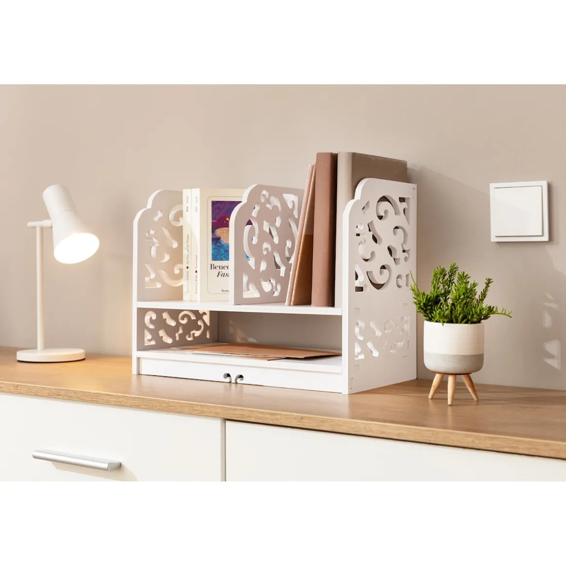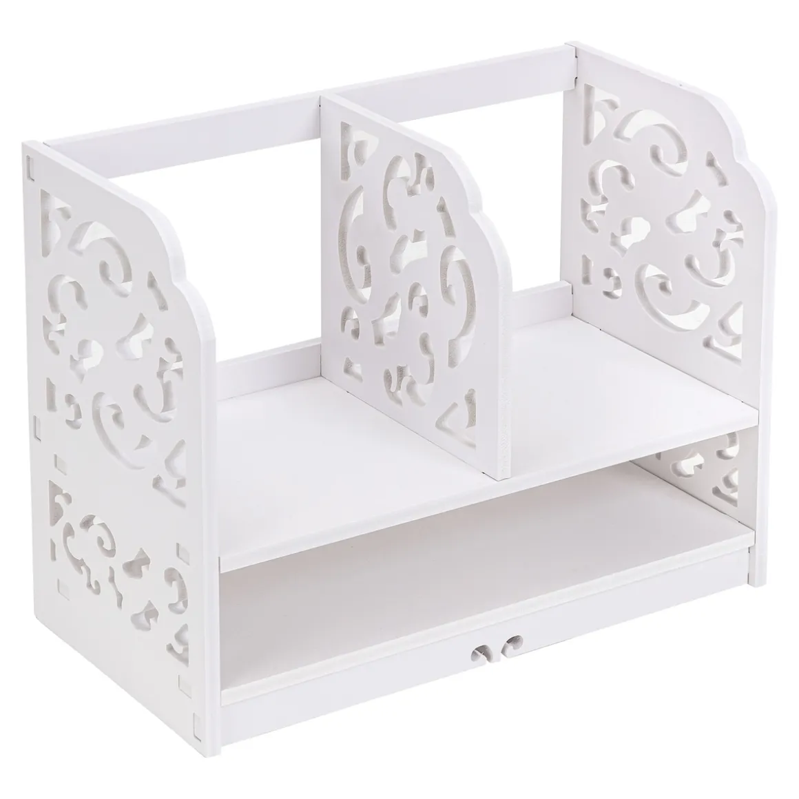 Wo Ordnung und Schönheit Hand in Hand gehen: In diesem Regal sind Bücher, Schreibutensilien u.v.m übersichtlich aufgeräumt. Mit seinen eleganten Ornament-Verzierungen wird es zum Blickfang in jedem Raum. Einfacher Aufbau dank Stecksystem.