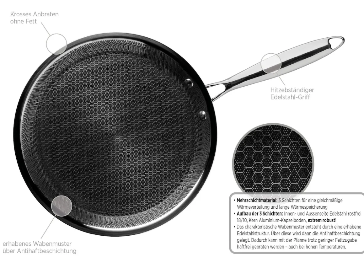 Gesund und fettarm Braten ohne auf die lecker krossen Röstaromen zu verzichten – das geht jetzt ganz einfach mit der Serie Hestia. Die Edelstahl-Pfannenserie der österreichischen Traditionsmarke Mäser erfüllt die Erwartungen all jener Hobbyköche, die Fleisch und Gemüse scharf anbraten wollen, ohne dass etwas anklebt. In den Pfannen wird über die Antihaftbeschichtung eine spezielle Edelstahl-Wabenstruktur gelegt, die auch die Optik bestimmt. Die Kombination aus beiden Schichten erlaubt das scharfe Anbraten mit nur wenig Fettzugabe und verhindert gleichzeitig, dass das Fleisch oder anderes Bratgut haften bleibt.