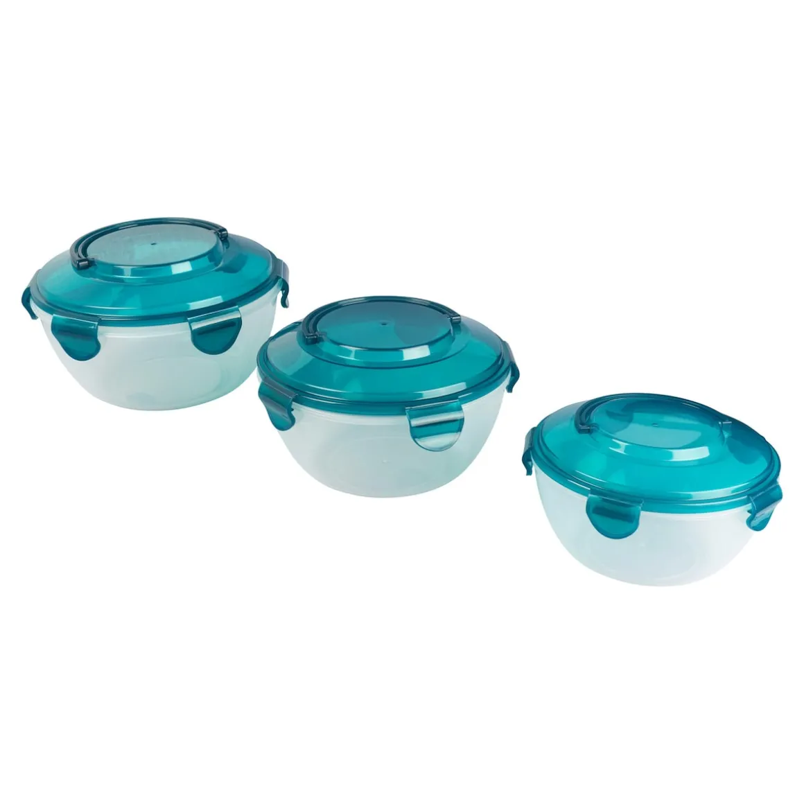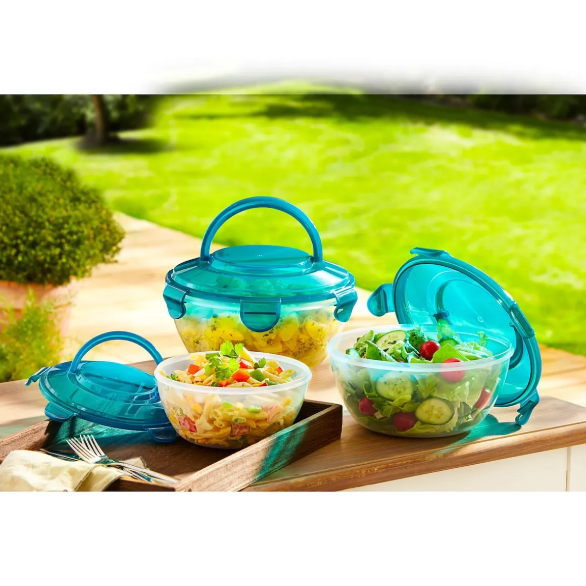Bringen Sie Party-Stimmung in Ihren Haushalt! Das praktische Set aus 3 großen, transparenten Schüsseln begeistert durch den sicheren Verschluss und den handlichen Griff, um Salate & Co. perfekt zu transportieren.