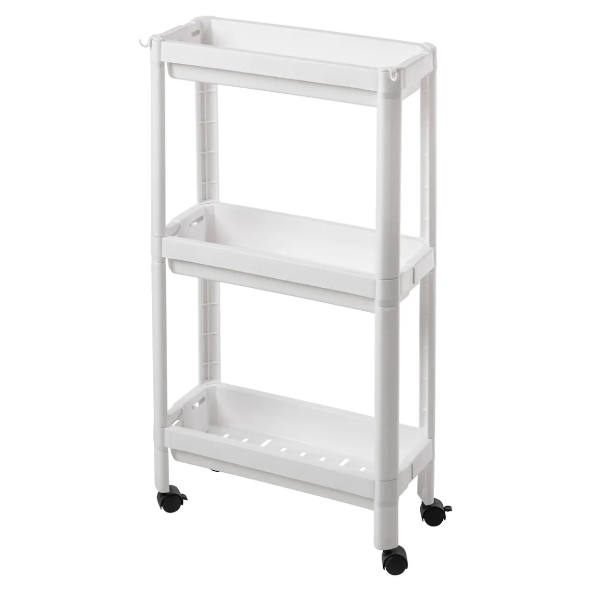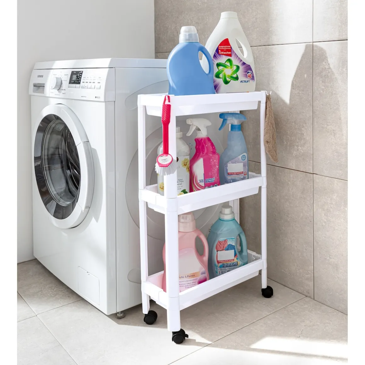Dank der verstellbaren Breite passt der Rollwagen in verschiedene Nischen und bietet Ihnen auf seinen 3 Etagen viel Platz: Die erhöhten Kanten sorgen für einen sicheren Stand von Putzmittel, Spülutensilien u.v.m. Mit 2 Haken für Bürsten & Co. und Rollen für ein einfaches Verschieben.