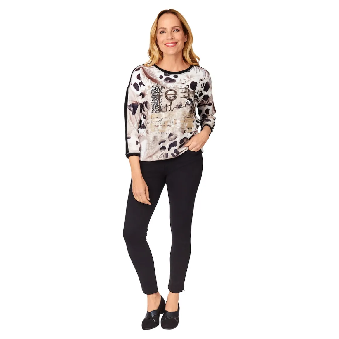 In diesem modernen Pullover-Shirt mit 3/4-Arm machen Sie immer eine gute Figur. Die Vorderseite besticht durch einen leichten Metallic-Effekt und funkelnde Glitzersteinchen, die Rückseite ist klassisch elegant in Schwarz gehalten. Mit Gummibund am Saum.
