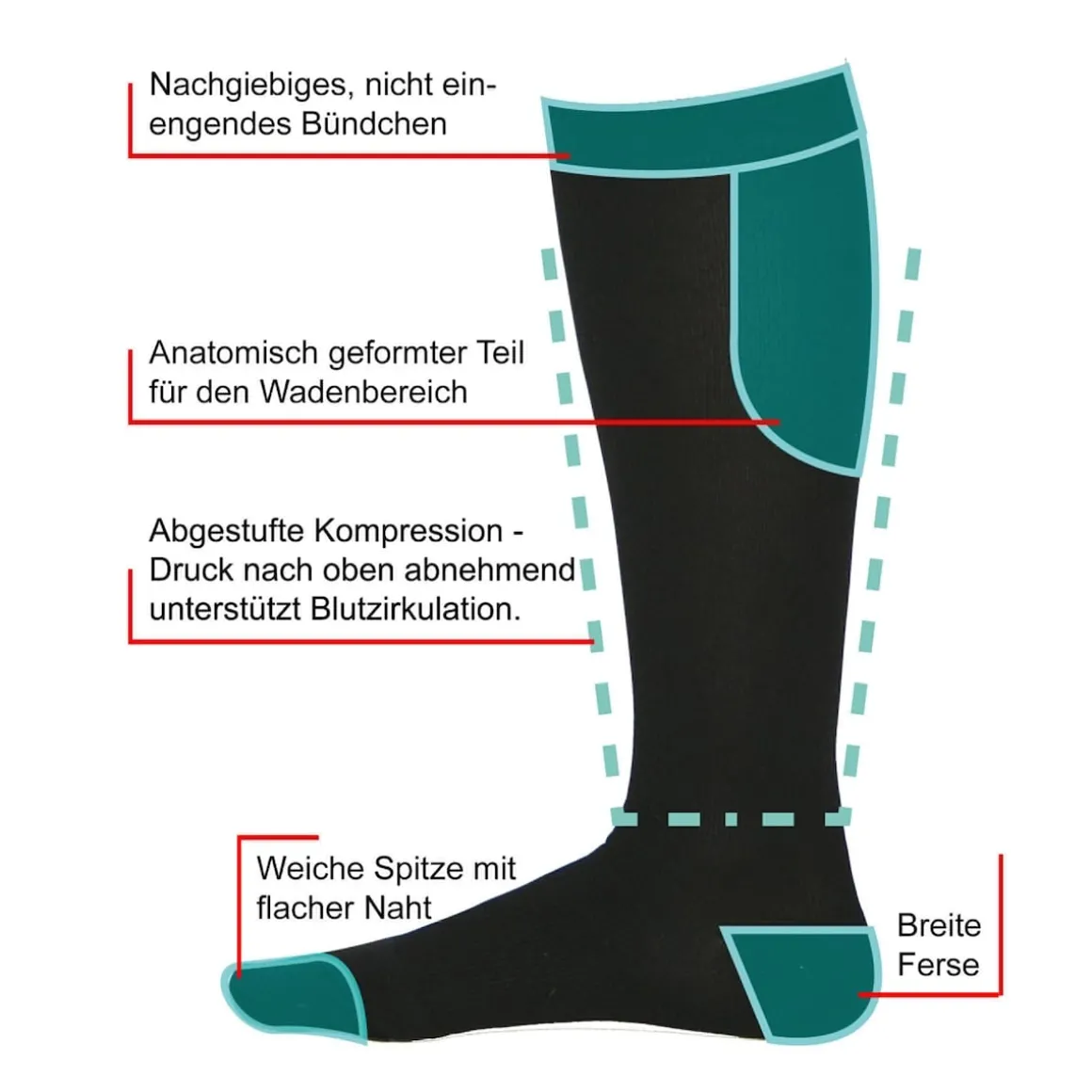 Die vom Knöchel nach oben hin abnehmende hohe Kompression fördert die gesunde Durchblutung der Beine und kann Venenerkrankungen vorbeugen.