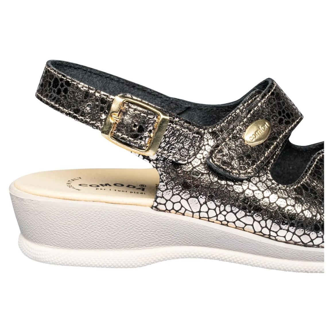 Goldschimmerndes Modell mit raffiniertem Dessin. Vorne 2 Klettverschlüsse. Schnalle an der Ferse. Obermaterial und Fußbett aus Leder. Antirutsch-Laufsohle.