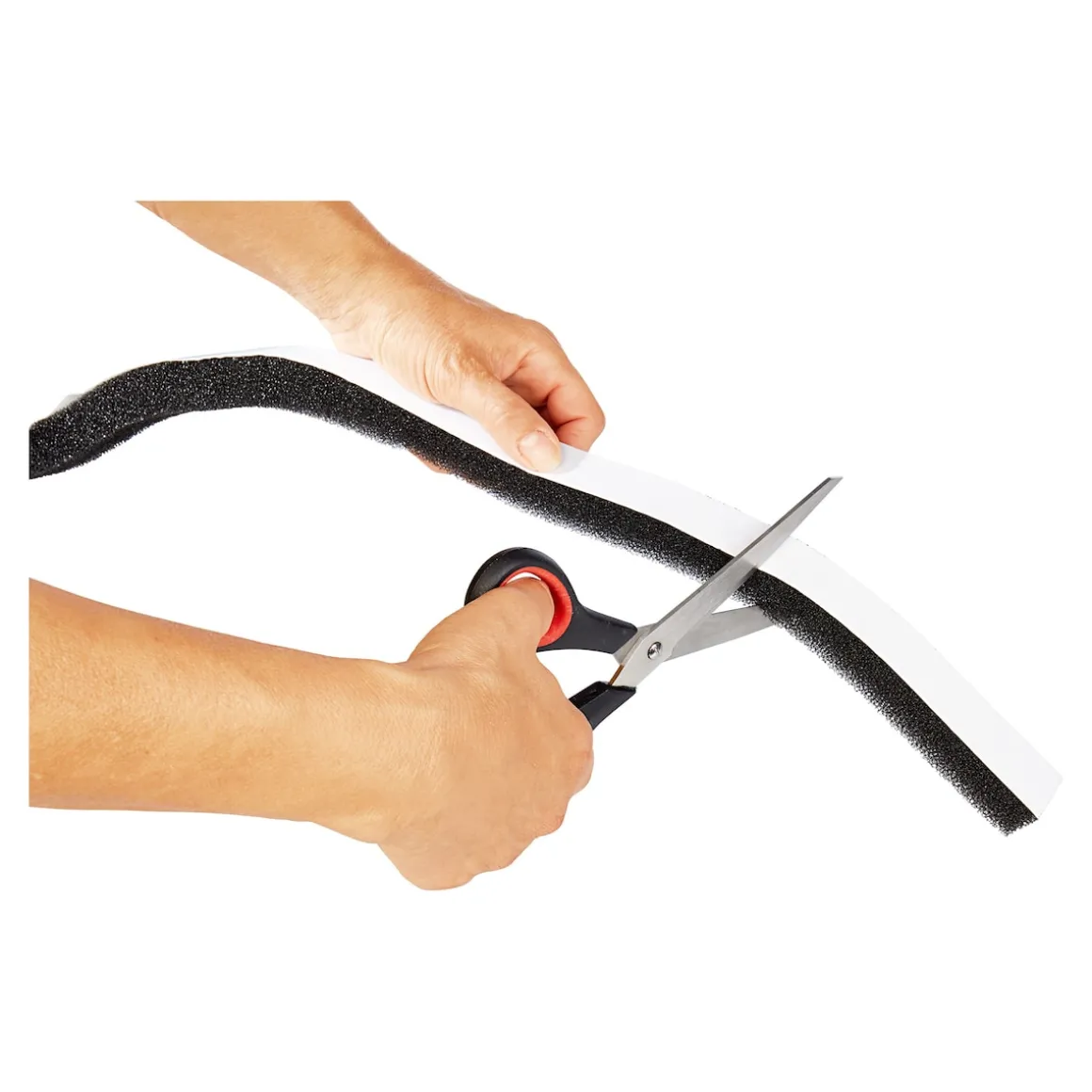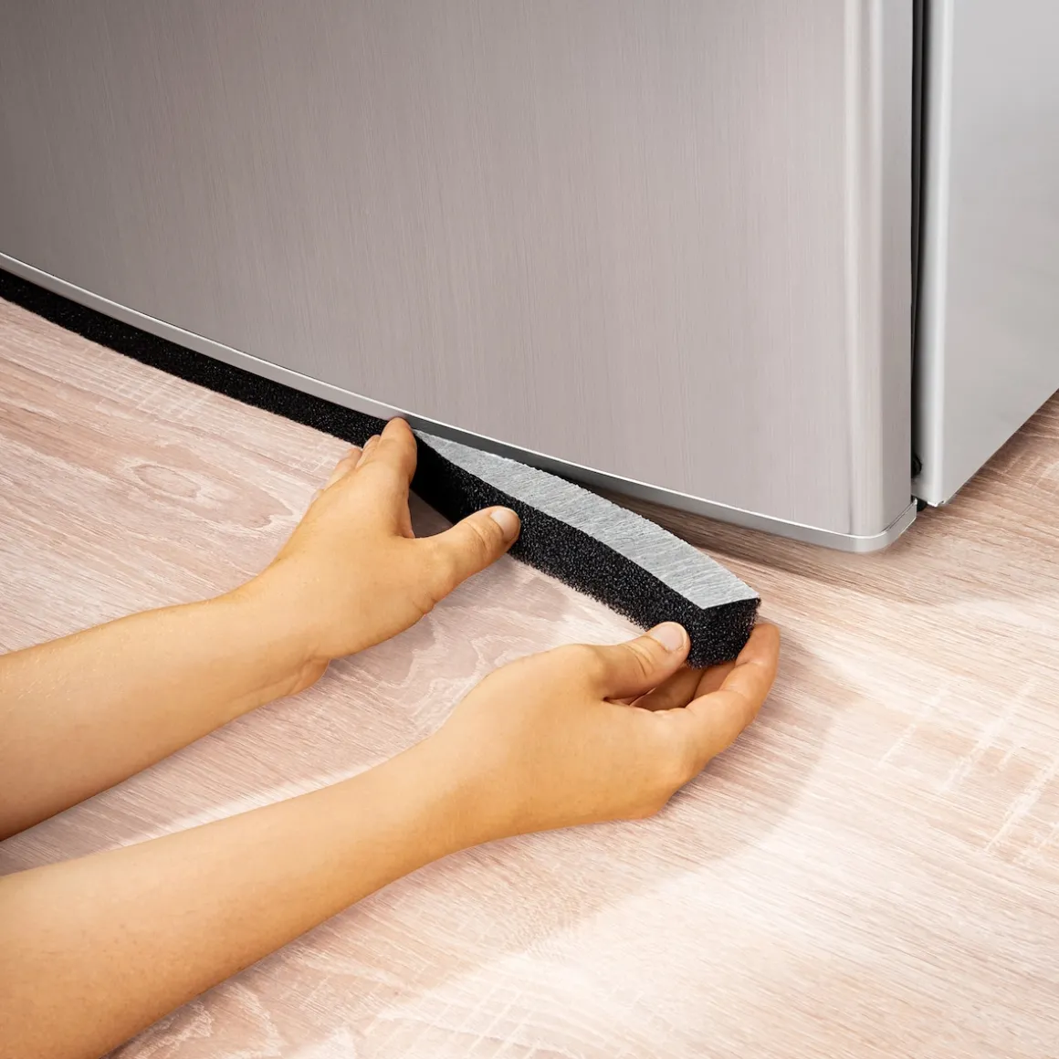 Das selbstklebende Band lässt sich im Nu individuell zuschneiden. Stets schnell zur Hand – ein guter Helfer! Neben der Abdichtung von Türen und Fenstern eignet es sich z. B. auch ideal, um enge, kleine Schlitze zwischen Kühlschrank und Boden abzukleben.