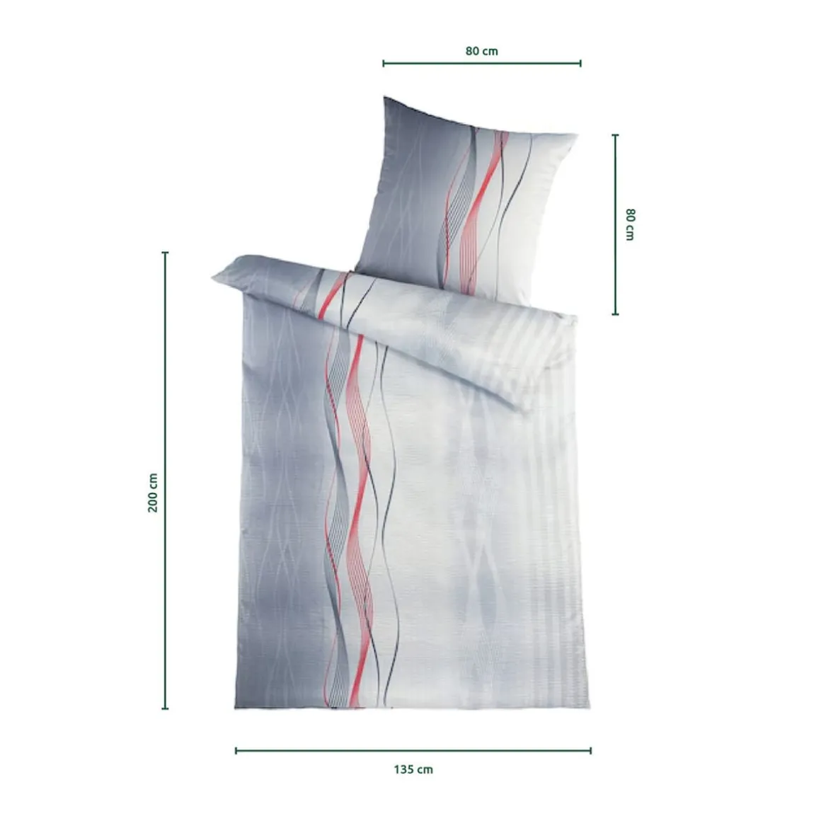 - Bettbezug: (LxB) 135×200 cm, Kissenbezug: (LxB) 80×80 cm