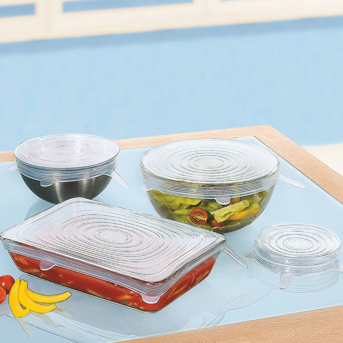 Mit den dehnbaren Silikondeckeln lassen sich Schüsseln, Gläser, Tassen oder Dosen luftdicht verschließen. Sie können für verschiedene Materialien wie Glas, Keramik oder Metall verwendet werden. Die Frischhaltedeckel schützen das Aroma von Lebensmitteln und verhindern gleichzeitig eine Geruchsbildung, Schimmel und Gefrierbrand. Dabei nehmen sie selbst keine Gerüche auf. Im Backofen oder der Mikrowelle vermeiden die Abdeckhauben Spritzer beim Erhitzen von Speisen. Im Kühl- oder Gefrierschrank sorgen sie dafür, dass Lebensmittel länger frisch bleiben und schließen Gerüche ein. Das stabile Material ist so robust, dass sich die Behälter platzsparend Stapeln lassen. Die dehnbaren Silikondeckel überzeugen durch ihre Langlebigkeit, Stabilität und Flexibilität.