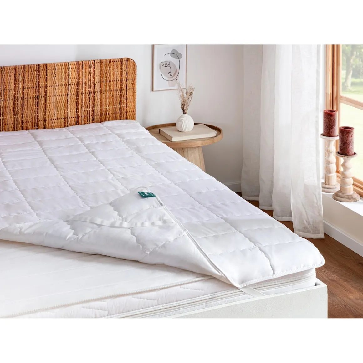 Dieser Topper schafft ein ideales Schlafklima dank des Mix aus hautsympathischem Baumwollbezug und Lyocell-Füllung. Die Lyocellfasern absorbieren Feuchtigkeit besonders effektiv, halten Sie angenehm kühl und trocken. Die praktischen Spanngummis an den Ecken gewährleisten einen sicheren Sitz auf Ihrer Matratze. Genießen Sie den Komfort und die einfache Pflege unseres Toppers, der sowohl waschmaschinen- als auch trocknergeeignet ist. Entdecken Sie jetzt, wie unser Topper Ihr Schlaferlebnis optimiert!