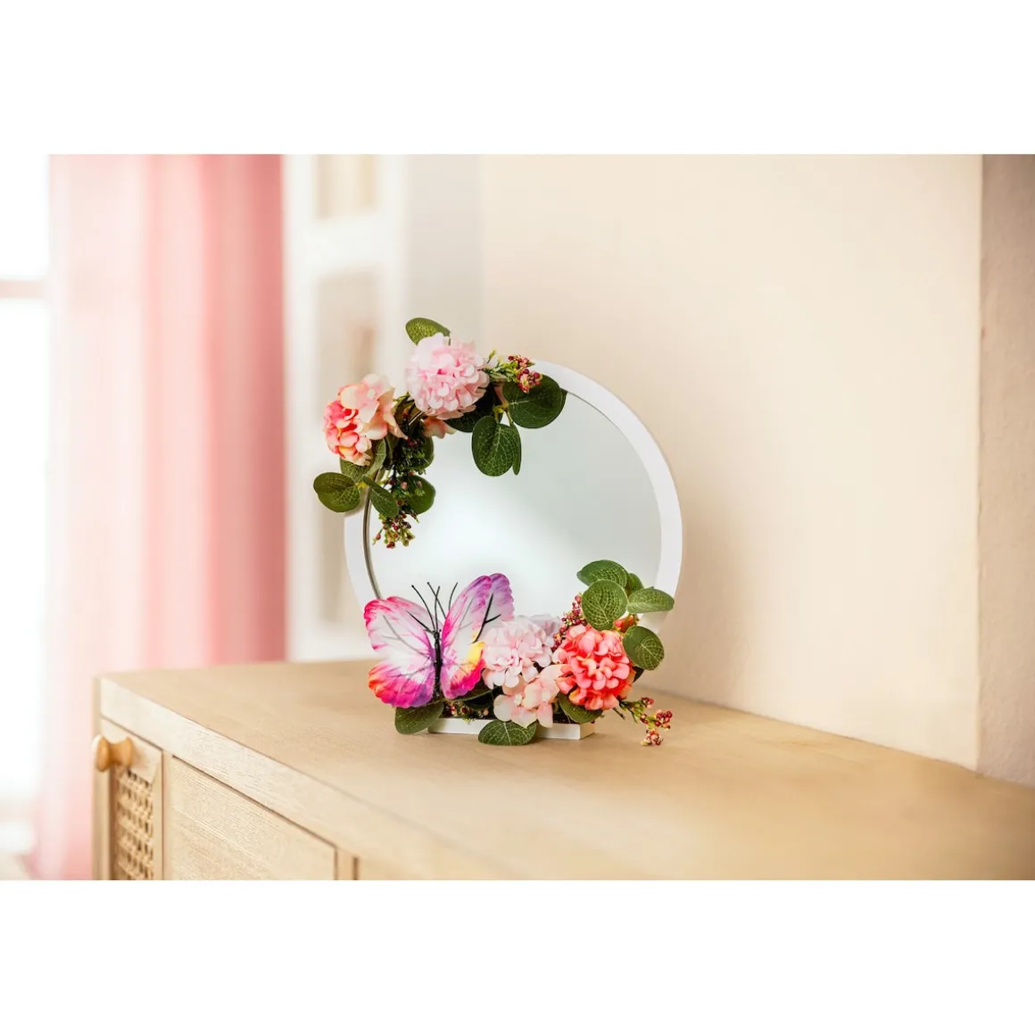 Ein Blick in diesen besonderen Spiegel genügt und Ihr Tag beginnt voll Freude und Harmonie! Umrahmt von üppigen Sommerblumen, grünem Blattwerk und einem zarten Schmetterling, blüht Ihr Spiegelbild im wahrsten Sinne des Wortes auf.