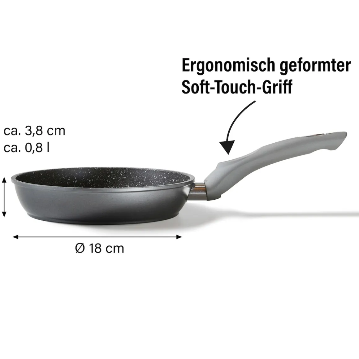 STONELINE – Das Original! Gesund fettfrei kochen und braten! Ein modernes Design in Kombination mit ergonomischen Soft-Touch-Griffen zeichnet die Bratpfannen der STONELINE Gourmundo Linie aus. Diese 18 cm Pfanne ist ein Muss in jeder Küche. Sie ist für sehr kleine Mengen optimal geeignet. Dank der speziellen STONELINE-Antihaftbeschichtung lassen sich Ihre Speisen – je nach Wunsch – mit oder ohne Bratfett und Ol zubereiten und ganz ohne Ankleben aus dem Kochgeschirr lösen. Hierbei spielt es keine Rolle, ob Sie auf Glaskeramik, Induktion, Elektro oder Gas kochen. In Pfannen mit der original STONELINE-Beschichtung bleiben keine hartnäckigen Reste haften und die einfache Handwäsche spart Ihnen Zeit und Mühe. 1 Bratpfanne Induktion, ø ca. 18 cm, Höhe: ca. 3,8 cm, ca. 0,8 l; Induktionsboden: ø ca. 14,9 cm Die wichtigsten Vorteile des STONELINE Kochgeschirrs auf einen Blick: Weltweit einzige Antihaftbeschichtung mit echten Steinpartikeln Kratzfeste STONELINE-Antihaftbeschichtung Vitaminschonend kochen und braten ohne Fett und Ol Optimales Bratergebnis und kross gebratenes Fleisch Auch für Vegetarier geeignet: Gemüse bleibt knackig und saftig Kein Anbrennen und kein Ankleben Super leicht zu reinigen Extra starker, verzugsfreier Boden Bodenstärke: ca. 4,8 mm Für alle Herdarten geeignet, auch Induktion Backofengeeignet bis 150 °C Material: Aluminiumguss Reinigungs- und Pflegetipps: Vor dem ersten Gebrauch empfehlen wir, Ihr Koch- oder Backgeschirr mit etwas Wasser und einem milden Spülmittel gründlich auszuwaschen. Verteilen Sie anschließend mit einem Papierküchentuch einige Tropfen Speiseöl auf der Beschichtung. Bei der weiteren Nutzung können Sie auf den Einsatz von Fett oder Ol verzichten! Dank dem Easy-Clean-Effekt wird die Reinigung per Hand empfohlen. Einfach mit heißem Wasser, Handspülmittel und einem weichen Schwamm auswischen.