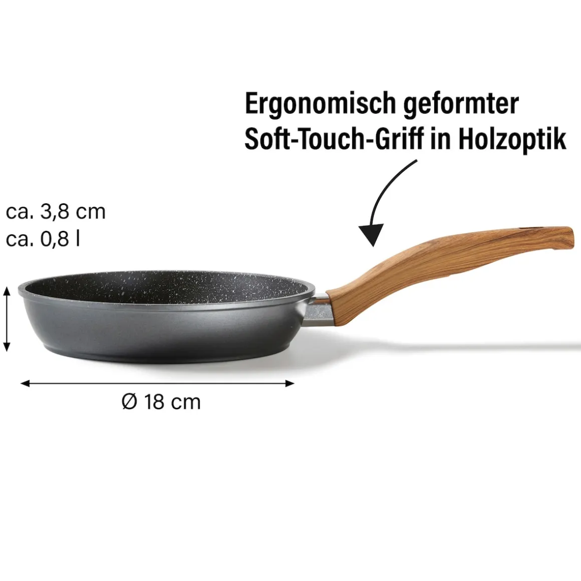 STONELINE – Das Original! Gesund fettfrei kochen und braten! Holz ist das angesagte Style-Element, um jedem Küchen-Ambiente einen warmen Akzent zu verleihen und eine beruhigende, ausgeglichene Atmosphäre zu schaffen. Die Back to Nature-Linie von STONELINE vereint diese Eigenschaften. Die Pfannen mit Griff in stilvoller Holzoptik werden selbst auf der gedeckten Tafel zu einem stimmigen Blickfang. Diese 18 cm Pfanne ist ein Muss in jeder Küche. Sie ist für sehr kleine Mengen optimal geeignet. Dank der speziellen STONELINE-Antihaftbeschichtung lassen sich Ihre Speisen – je nach Wunsch – mit oder ohne Bratfett und Ol zubereiten und ganz ohne Ankleben aus dem Kochgeschirr lösen. Hierbei spielt es keine Rolle, ob Sie auf Glaskeramik, Induktion, Elektro oder Gas kochen. In Pfannen mit der original STONELINE-Beschichtung bleiben keine hartnäckigen Reste haften und die einfache Handwäsche spart Ihnen Zeit und Mühe. 1 Bratpfanne Induktion, ø ca. 18 cm, Höhe: ca. 3,8 cm, ca. 0,8 l; Induktionsboden: ø ca. 14,9 cm Die wichtigsten Vorteile des STONELINE Kochgeschirrs auf einen Blick: Weltweit einzige Antihaftbeschichtung mit echten Steinpartikeln Kratzfeste STONELINE-Antihaftbeschichtung Vitaminschonend kochen und braten ohne Fett und Ol Optimales Bratergebnis und kross gebratenes Fleisch Auch für Vegetarier geeignet: Gemüse bleibt knackig und saftig Kein Anbrennen und kein Ankleben Super leicht zu reinigen Extra starker, verzugsfreier Boden Bodenstärke: ca. 4,8 mm Für alle Herdarten geeignet, auch Induktion Backofengeeignet bis 180 °C Material: Aluminiumguss Reinigungs- und Pflegetipps: Vor dem ersten Gebrauch empfehlen wir, Ihr Koch- oder Backgeschirr mit etwas Wasser und einem milden Spülmittel gründlich auszuwaschen. Verteilen Sie anschließend mit einem Papierküchentuch einige Tropfen Speiseöl auf der Beschichtung. Bei der weiteren Nutzung können Sie auf den Einsatz von Fett oder Ol verzichten! Dank dem Easy-Clean-Effekt wird die Reinigung per Hand empfohlen. Einfach mit heißem Wasser, Handspülmittel und einem weichen Schwamm auswischen.