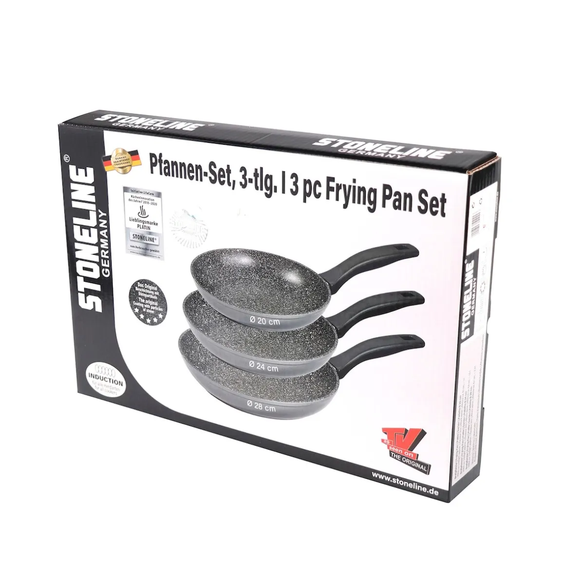 STONELINE – Das Original! Gesund fettfrei kochen und braten! Dieses Pfannen-Set gehört in jede Küche. Zaubern Sie knusprige Bratkartoffeln, leckeres Gemüse, luftige Eierspeisen und kross gebratenes Fleisch und verwenden Sie dazu, je nach Bedarf, die kleinere oder die größere Pfanne! Dank der speziellen STONELINE-Antihaftbeschichtung lassen sich Ihre Speisen – je nach Wunsch – mit oder ohne Bratfett und Ol zubereiten und ganz ohne Ankleben aus dem Kochgeschirr lösen. Ob braten oder schmoren – mit diesem Pfannen-Trio sind Sie bestens ausgerüstet! Dieses 3 teilige Set besteht aus: 1 Bratpfanne, ø ca. 20 cm, Höhe: ca. 4,1 cm, ca. 1,0 l 1 Bratpfanne, ø ca. 24 cm, Höhe: ca. 4,4 cm, ca. 1,5 l 1 Bratpfanne, ø ca. 28 cm, Höhe: ca. 4,7 cm, ca. 2,3 l Die wichtigsten Vorteile des STONELINE Kochgeschirrs auf einen Blick: Weltweit einzige Antihaftbeschichtung mit echten Steinpartikeln Kratzfeste STONELINE-Antihaftbeschichtung Vitaminschonend kochen und braten ohne Fett und Ol Optimales Bratergebnis und kross gebratenes Fleisch Auch für Vegetarier geeignet: Gemüse bleibt knackig und saftig Kein Anbrennen und kein Ankleben Super leicht zu reinigen Extra starker, verzugsfreier Boden Bodenstärke: 4,5 mm Für alle Herdarten geeignet, auch Induktion Backofengeeignet bis 180 °C Material: Aluminiumguss