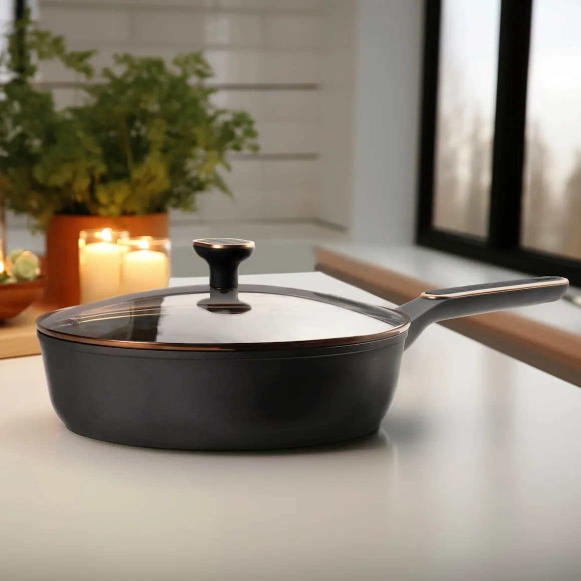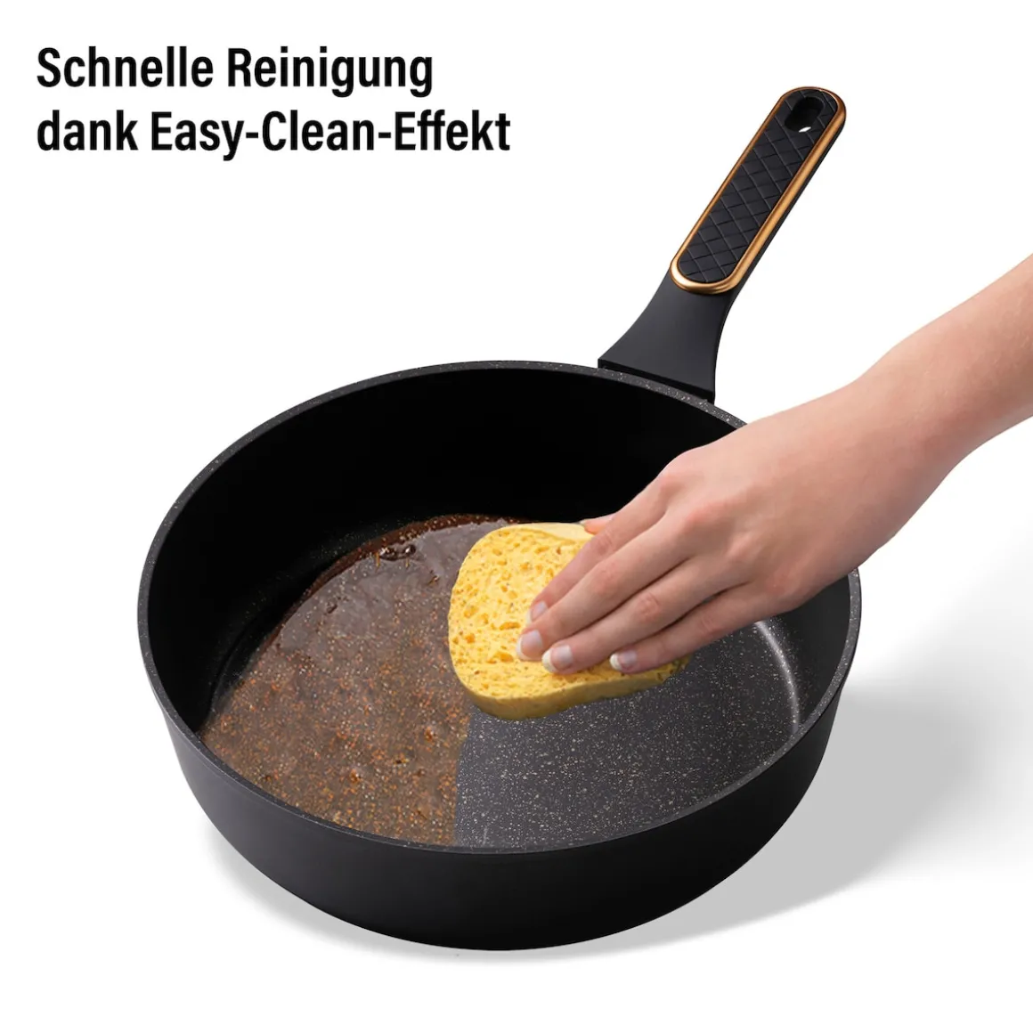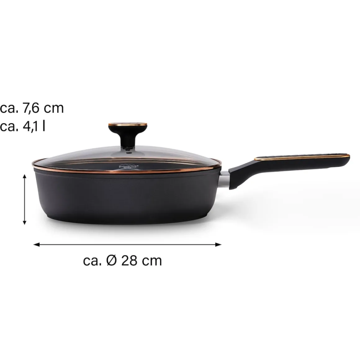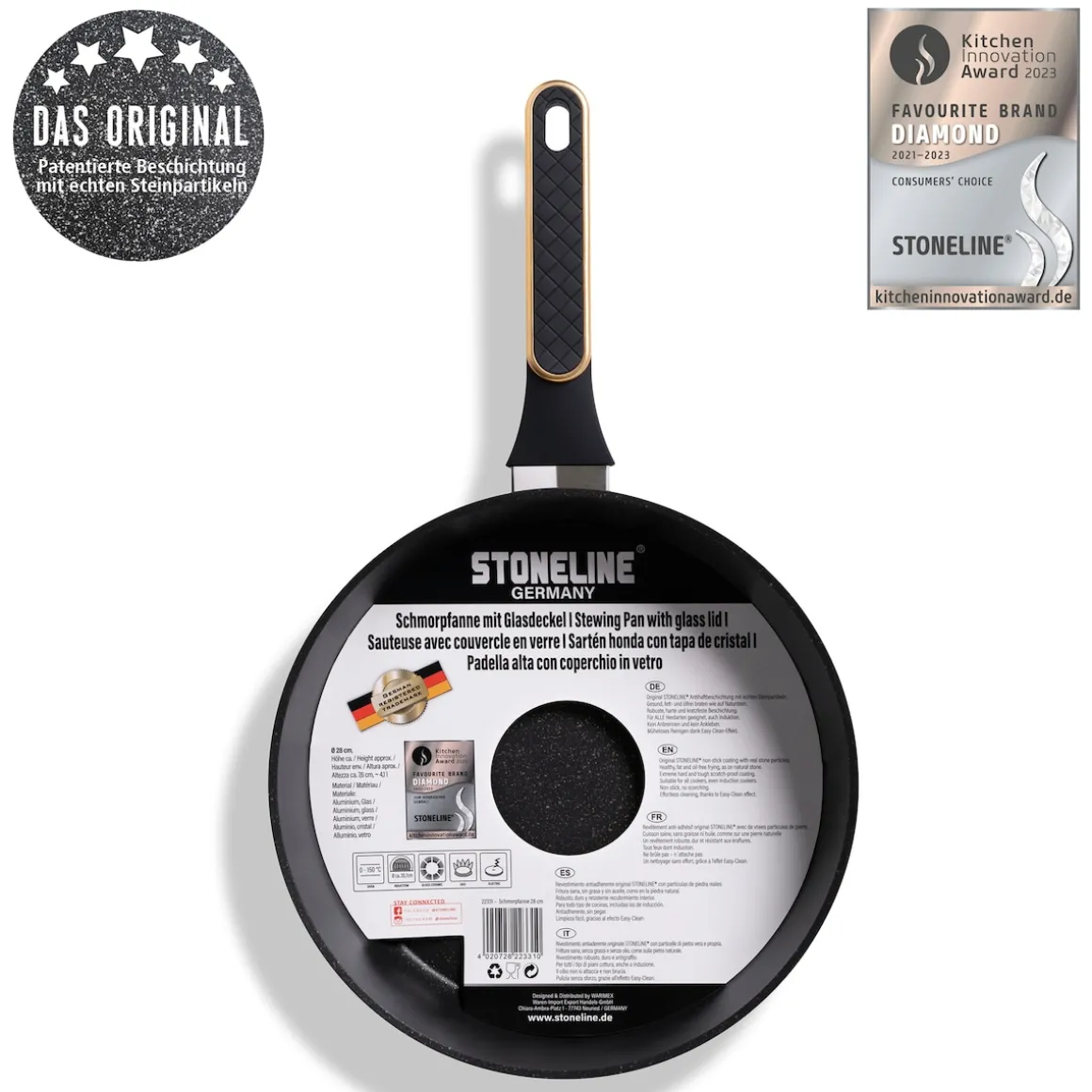 STONELINE – Das Original!Gesund fettfrei kochen und braten! Eleganz und Leidenschaft. Verleihe deiner Küche einen modernen, edlen Touch mit der STONELINE Schmorpfanne in Mattschwarz. Die eleganten Roségold-Details an dem Deckel und den Griffen setzen stilvolle Akzente und bringen einen Hauch von Luxus in deine Küche. Die einzigartige Farbkombination von Mattschwarz und Roségold vereint schlichte Eleganz mit einem modernen, luxuriösen Design. Mit diesem Set machst du nicht nur dein Kochen noch mehr zum Erlebnis, sondern setzt auch ein Statement für modernes Design und stilvolles Kochen. Hol dir das perfekte Zusammenspiel aus Funktion und Ästhetik und lass deine kulinarischen Kreationen noch mehr glänzen! Die Universalpfanne ist der perfekte Küchenhelfer für jeden Anlass. Egal, ob du schnell etwas braten oder ein aufwendigeres Gericht zaubern möchtest – mit der praktischen Antihaft Pfanne mit Deckel hast du immer das richtige Kochgeschirr zur Hand und die Zubereitung deiner Lieblingsgerichte macht doppelt soviel Spaß. Mit dem extra hohen Rand von 7,6 cm und über 4 Liter Fassungsvermögen eignet sie sich hervorragend für alle Brat- und Schmorgerichte und lässt sich auch für Gerichte nutzen, die etwas mehr Platz brauchen. Der Glasdeckel mit Edelstahlrand in Roségold ist eine großartige Ergänzung zu deinem Kochgeschirr. Der Knauf des Deckels bleibt angenehm kühl, damit du dich während des Kochvorgangs nicht verbrennst. So wird das Kochen noch komfortabler und sicherer! Mit dieser Pfanne kannst du dich auf jede Mahlzeit freuen, die du mit Liebe und Kreativität zubereitest. Sie bringt nicht nur Stil in deine Küche, sondern sorgt auch dafür, dass du dich beim Kochen voll und ganz auf den Geschmack konzentrieren kannst. Hol dir das Set und genieße das Kochen in vollen Zügen! Dank der speziellen STONELINE Antihaftbeschichtung in Goldoptik kannst du deine Speisen in der Pfanne – je nach Wunsch – mit oder ohne Bratfett und Ol zubereiten und sie ganz ohne Ankleben aus dem Kochgeschirr lösen. Es spielt keine Rolle, ob du auf Glaskeramik, Induktion, Elektro oder Gas kochst. In der Pfanne mit der original STONELINE Antihaftbeschichtung bleiben keine hartnäckigen Reste haften und die einfache Handwäsche spart dir Zeit und Mühe. 1 Schmorpfanne, ø ca. 28 cm, Höhe: ca. 7,6 cm, ca. 4,1 l, Induktionsboden: ø ca. 20,7 cm1 Glasdeckel, ø ca. 28 cm In der Farbe: Schwarz / Roségold Die wichtigsten Vorteile auf einen Blick: Weltweit einzige Antihaftbeschichtung mit echten Steinpartikeln Kratzfeste STONELINE-Antihaftbeschichtung Glasdeckel mit Edelstahlrand Vitaminschonend kochen und braten ohne Fett und Ol Optimales Bratergebnis und kross gebratenes Fleisch Auch für Vegetarier geeignet: Gemüse bleibt knackig und saftig Kein Anbrennen und kein Ankleben Super leicht zu reinigen dank Easy-Clean Effekt Extra starker, verzugsfreier Boden Bodenstärke: ca. 4 mm Für alle Herdarten geeignet, auch Induktion Backofengeeignet bis 150 °C Material: Aluminium Reinigungs- und Pflegetipps: Vor dem ersten Gebrauch empfehlen wir, dein Koch- oder Backgeschirr mit etwas Wasser und einem milden Spülmittel gründlich auszuwaschen. Verteile anschließend mit einem Papierküchentuch einige Tropfen Speiseöl auf der Beschichtung.Bei der weiteren Nutzung kannst du auf den Einsatz von Fett oder Ol verzichten!Dank dem Easy-Clean-Effekt wird die Reinigung per Hand empfohlen. Einfach mit heißem Wasser, Handspülmittel und einem weichen Schwamm auswischen.