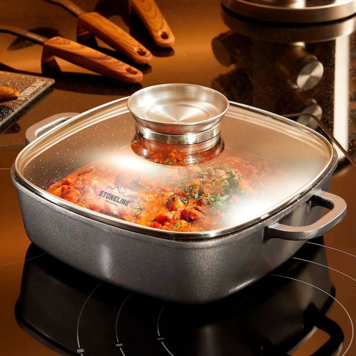 STONELINE – Das Original! Gesund fettfrei kochen und braten! Diese Eckpfanne lässt sich multifunktional einsetzen: Egal, ob Sie Fleisch anbraten, ein Filet garen, einen Braten oder einen Auflauf im Backofen schmoren möchten, mit dieser Pfanne gelingt Ihnen einfach alles. Die Eckpfanne hat den Vorteil, dass sie gegenüber einer herkömmlichen runden 24 cm Bratpfanne mehr als 25 % zusätzliche Bratfläche bietet! Der einzigartige Aroma-Glasdeckel ermöglicht eine dosierte Zugabe von Flüssigkeiten wie z. B. Wein, flüssige Gewürze oder andere Essenzen über den Deckelknauf. So erhalten Ihre verfeinerten Speisen den unverkennbaren Geschmack der zugegebenen Aromen. Die Eckpfanne ist bis 220 °C backofengeeignet und mit der bewährten STONELINE Antihaftbeschichtung ausgestattet. Zum Herausholen aus dem Ofen ziehen Sie einfach die mitgelieferten Thermo-Schutzhüllen über die Griffe. 1 Eckpfanne, ca. 24 x 24 cm, Höhe: ca. 6,7 cm, ca. 3,0 l 1 Aromaglasdeckel, ca. 24 x 24 cm 2 Thermogriffschützer Die wichtigsten Vorteile des STONELINE Kochgeschirrs auf einen Blick: Weltweit einzige Antihaftbeschichtung mit echten Steinpartikeln Kratzfeste STONELINE-Antihaftbeschichtung Optimales Bratergebnis und kross gebratenes Fleisch Bester Geschmack Vitaminschonend kochen und braten ohne Fett und Ol Kein Anbrennen und kein Ankleben Super leicht zu reinigen Für alle Herdarten geeignet, auch Induktion Extra starker, verzugsfreier Boden Bodenstärke 4,8 mm Backofengeeignet bis 220 °C (ohne Deckel, ohne Thermogriffschützer) / 180 °C (mit Deckel, ohne Thermogriffschützer) Material: Aluminiumguss Reinigungs- und Pflegetipps Vor dem ersten Gebrauch empfehlen wir, Ihr Kochgeschirr mit etwas Wasser und einem milden Spülmittel gründlich auszuwaschen. Verteilen Sie anschließend mit einem Papierküchentuch einige Tropfen Speiseöl auf der Beschichtung. Bei der weiteren Nutzung können Sie auf den Einsatz von Fett oder Ol verzichten! Dank dem Easy-Clean-Effekt wird die Reinigung per Hand empfohlen. Einfach mit heißem Wasser, Handspülmittel und einem weichen Schwamm auswischen.