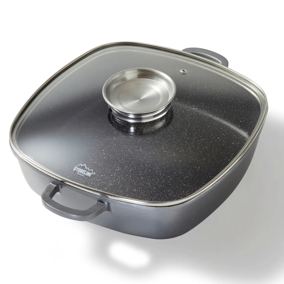 STONELINE – Das Original!Gesund fettfrei kochen und braten! Diese 28 cm Eckpfanne ist vielseitig einsetzbar und für jegliche Brat- und Schmorgerichte bestens geeignet. Dank der eckigen Form ergibt sich eine zusätzliche Bratfläche von mehr als 25 % gegenüber runden Pfannen. Diese Eckpfanne ist ein Muss für jeden Küchenhaushalt. Der einzigartige Aroma-Glasdeckel ermöglicht eine dosierte Zugabe von Flüssigkeiten wie z. B. Wein, flüssige Gewürze oder andere Essenzen über den Deckelknauf. So erhalten Ihre verfeinerten Speisen den unverkennbaren Geschmack der zugegebenen Aromen. Die bis zu 220 °C backofengeeignete Eckpfanne können Sie dank der mitgelieferten Thermo-Schutzhüllen einfach aus dem Backofen holen. Dank der speziellen STONELINE-Antihaftbeschichtung lassen sich Ihre Speisen – je nach Wunsch – mit oder ohne Bratfett und Ol zubereiten und ganz ohne Ankleben aus dem Kochgeschirr lösen. Hierbei spielt es keine Rolle, ob Sie auf Glaskeramik, Induktion, Elektro oder Gas kochen. In Kochgeschirr mit der original STONELINE-Beschichtung bleiben keine hartnäckigen Reste haften und die einfache Handwäsche spart Ihnen Zeit und Mühe. 1 Eckpfanne, ca. 28 x 28 cm, Höhe: ca. 7,5 cm, ca. 4,9 l1 Aromaglasdeckel, ca. 28 x 28 cm2 Thermogriffschützer Die wichtigsten Vorteile des STONELINE Kochgeschirrs auf einen Blick: Weltweit einzige Antihaftbeschichtung mit echten Steinpartikeln Kratzfeste STONELINE-Antihaftbeschichtung Vitaminschonend kochen und braten ohne Fett und Ol Optimales Bratergebnis und kross gebratenes Fleisch Auch für Vegetarier geeignet: Gemüse bleibt knackig und saftig Kein Anbrennen und kein Ankleben Super leicht zu reinigen Extra starker, verzugsfreier Boden Bodenstärke: 5 mm Für alle Herdarten geeignet, auch Induktion Backofengeeignet bis 220 °C (ohne Deckel, ohne Thermogriffschützer) / 180 °C (mit Deckel, ohne Thermogriffschützer) Material: Aluminiumguss Reinigungs- und Pflegetipps: Vor dem ersten Gebrauch empfehlen wir, Ihr Koch- oder Backgeschirr mit etwas Wasser und einem milden Spülmittel gründlich auszuwaschen.Verteilen Sie anschließend mit einem Papierküchentuch einige Tropfen Speiseöl auf der Beschichtung.Bei der weiteren Nutzung können Sie auf den Einsatz von Fett oder Ol verzichten!Dank dem Easy-Clean-Effekt wird die Reinigung per Hand empfohlen. Einfach mit heißem Wasser, Handspülmittel und einem weichen Schwamm auswischen.