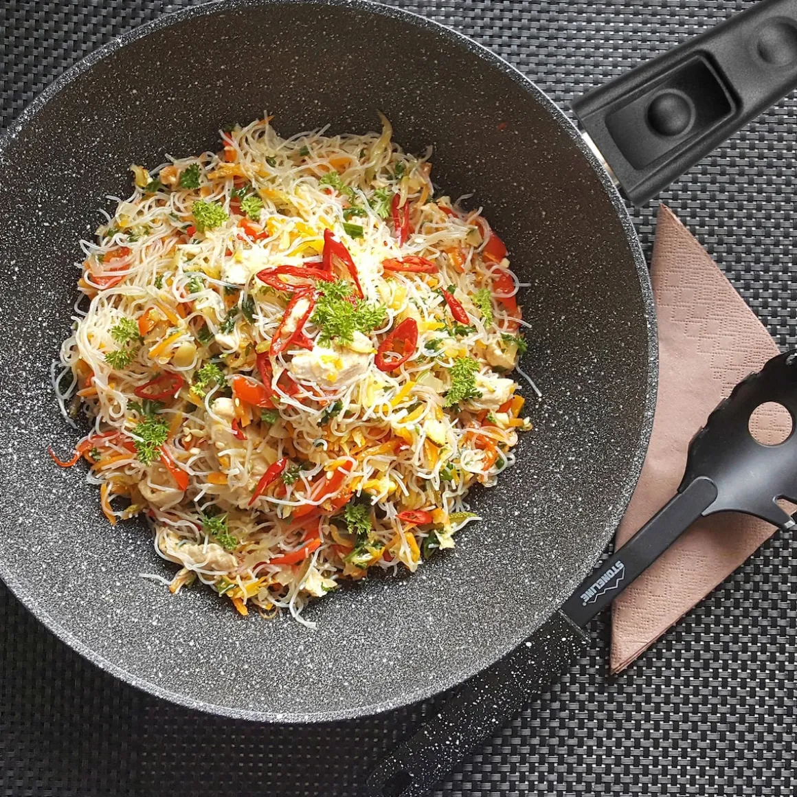 STONELINE Made in Germany!Gesund fettfrei kochen und braten!Sie möchten asiatischen Kochgenuss nicht nur im Chinesischen oder Thailändischen Restaurant genießen, sondern die typischen Gerichte auch zuhause öfter einmal selbst zubereiten?Mit diesem STONELINE-Wok ist es ein Leichtes, zarten Fisch, frisches Geflügelfleisch und knackiges Gemüse in fernöstliche Gaumenfreuden zu verwandeln.Braten Sie die Zutaten kurz scharf an und schieben Sie sie zum langsamen Garen an die Pfannenränder.Dann auf den Teller oder in die Schüssel, Gabeln oder Ess-Stäbchen dazu – und das exotische Vergnügen kann beginnen!Mit abnehmbarem Griff: Verwandeln Sie Ihren Wok spielend leicht in eine Auflaufform zum Überbacken und Warmhalten von Gerichten im Backofen.1 Wok, ø ca. 30 cm, Höhe: ca. 9,5 cm, ca. 4,3 l1 abnehmbarer StielgriffDie wichtigsten Vorteile des STONELINE Kochgeschirrs auf einen Blick: Kratzfeste STONELINE-Antihaftbeschichtung Optimales Bratergebnis und kross gebratenes Fleisch Bester Geschmack Vitaminschonend kochen und braten ohne Fett und Ol Kein Anbrennen und kein Ankleben Super leicht zu reinigen Für alle Herdarten geeignet, auch Induktion Extra starker, verziehfreier Boden Bodenstärke 4,5 mm Backofengeeignet bis 220 °C (ohne Griff) / 200 °C (mit Griff) Material: AluminiumReinigungs- und PflegetippsVor dem ersten Gebrauch empfehlen wir, Ihr Kochgeschirr mit etwas Wasser und einem milden Spülmittel gründlich auszuwaschen.Verteilen Sie anschließend mit einem Papierküchentuch einige Tropfen Speiseöl auf der Beschichtung.Bei der weiteren Nutzung können Sie auf den Einsatz von Fett oder Ol verzichten!Dank dem Easy-Clean-Effekt wird die Reinigung per Hand empfohlen. Einfach mit heißem Wasser, Handspülmittel und einem weichen Schwamm auswischen.