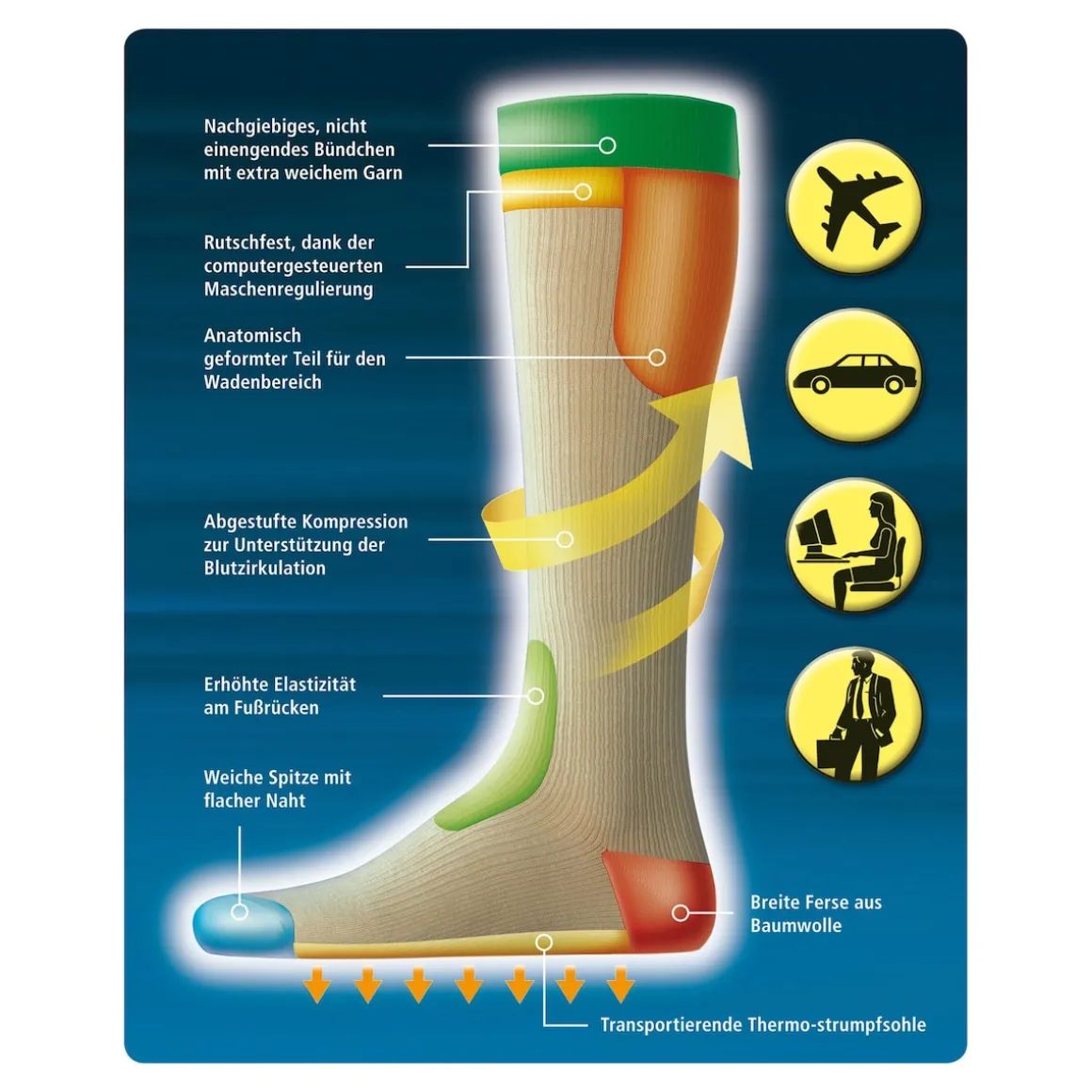 Ein anatomisch geformter Teil im Wadenbereich gewährleistet optimale Passform und Druckverteilung. Besonders angenehm ist das nachgiebige, nicht einengende Bündchen mit extra Garn, das für Halt sorgt, ohne einzuschneiden. Rutschfestigkeit garantiert die computergesteuerte Maschenregulierung, die den Strumpf exakt an Ort und Stelle hält – auch bei Bewegung.