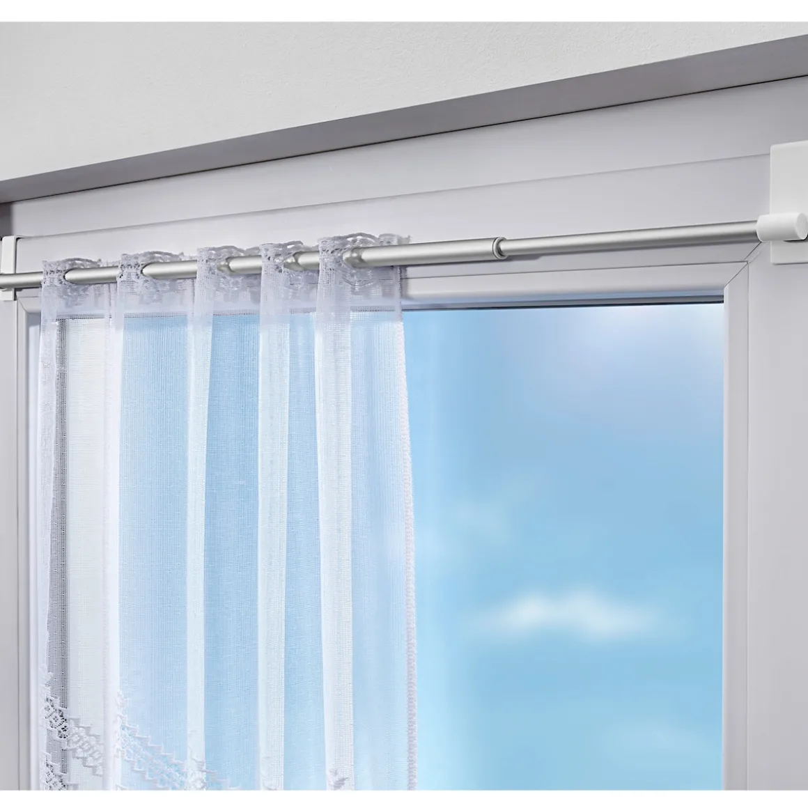 Die Teleskop-Gardinenstange lässt sich stufenlos ausziehen und der Fensterbreite anpassen. Einfach mit den beiden Haken am Fensterrahmen einhängen – ohne Bohren oder Kleben.