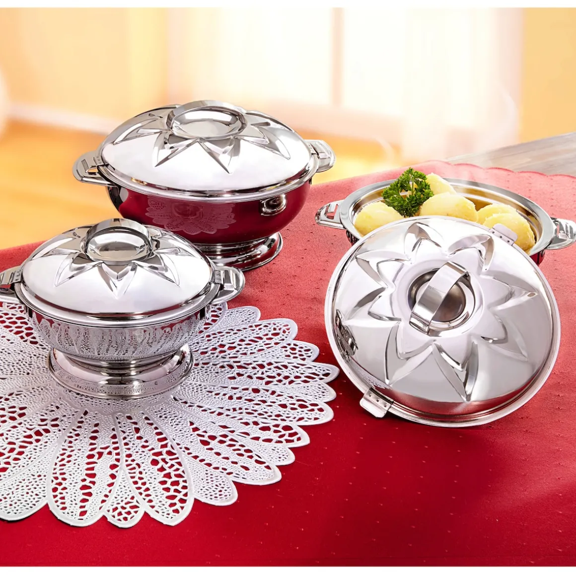 Diese praktischen Thermoschüsseln eignen sich perfekt zur Aufbewahrung von Speisen und kommen mit ihrem schönen Muster auf jedem Esstisch gut zur Geltung. Der Deckel kann durch eine einfache Drehung geöffnet werden.