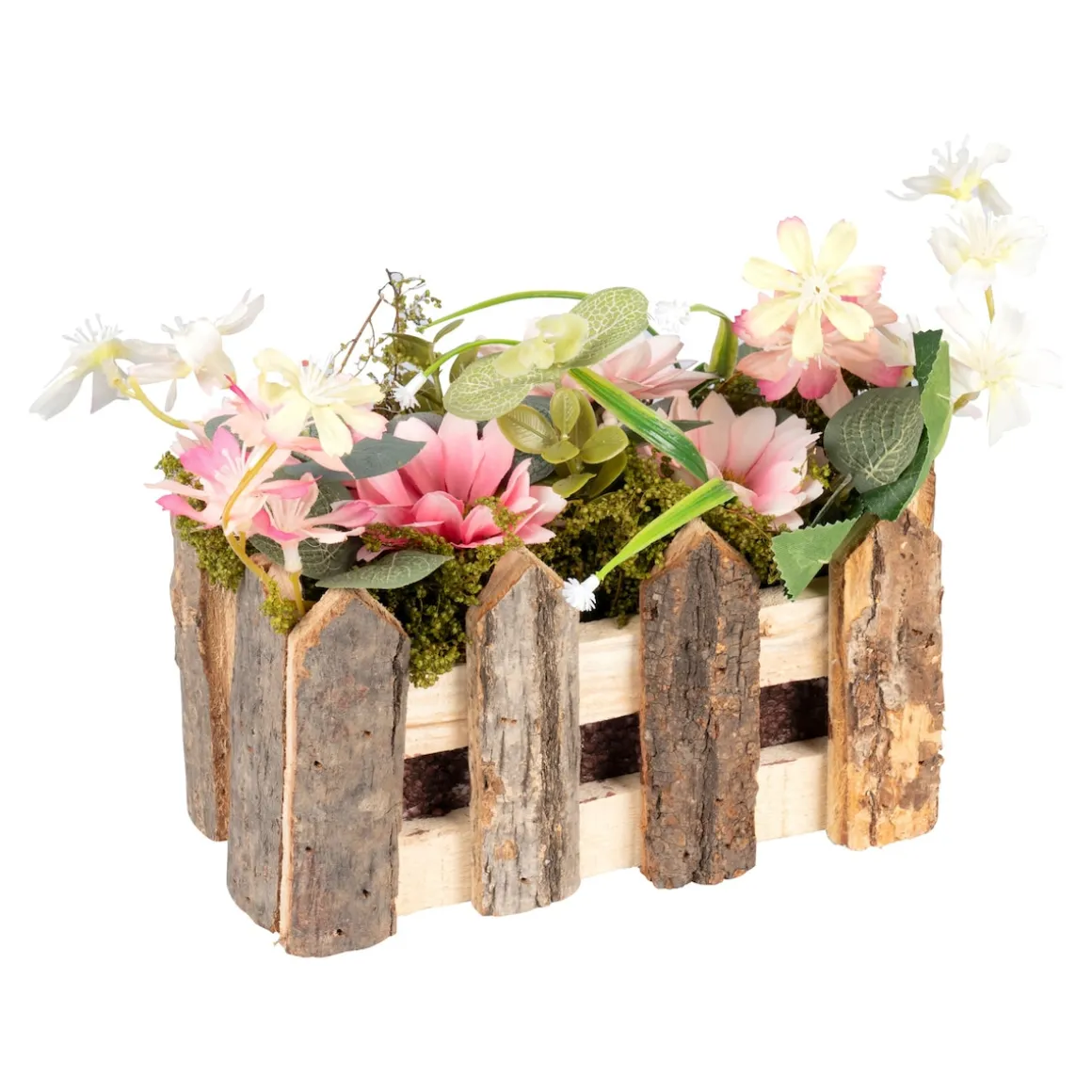 Sieht aus wie ein kleiner Gartenzaun, steckt aber voller blühender Überraschungen: Die rustikalen Holzelemente umarmen kunstvoll arrangierte, täuschend echte Blumen – eine Kombi, die nie verblüht! Perfekt für den Tisch, das Fensterbrett oder jede kleine Ecke, die nach Charme schreit.