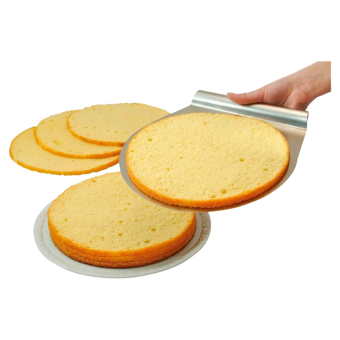 Das Messer dient nicht nur zum Schneiden, sondern eignet sich dank seiner breiten Klinge auch hervorragend, um den Kuchen bzw. die Torte gleichmäßig mit einer Glasur oder Creme zu bestreichen. Mit dem Tortenhebeblech (auch Kuchenretter genannt) können Sie die einzelnen Böden ganz einfach herunterheben. Auch die fertig geschichtete und dadurch oftmals schwere Torte lässt sich mit dem Hebeblech mühelos auf eine passende Tortenplatte heben.