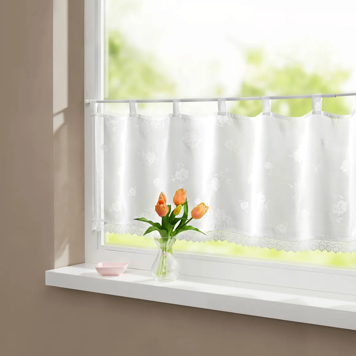 Die Transparent-Bistrogardine überzeugt durch ihr hochwertiges Material und das dezente Blumendruck-Design. Sie lässt viel Licht in den Raum und sorgt gleichzeitig für eine stilvolle Fensterdekoration – ideal für Küche, Bad oder kleinere Fensterbereiche.