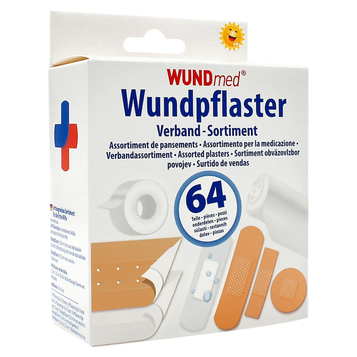 60 wasserfeste und atmungsaktive Pflasterstrips in verschiedenen Größen. Dazu 2 luftdurchlässige Wundpflaster zum individuellen Zuschneiden, 1 Mullbinde und 1 Heftpflaster für das Fixieren von Verbände