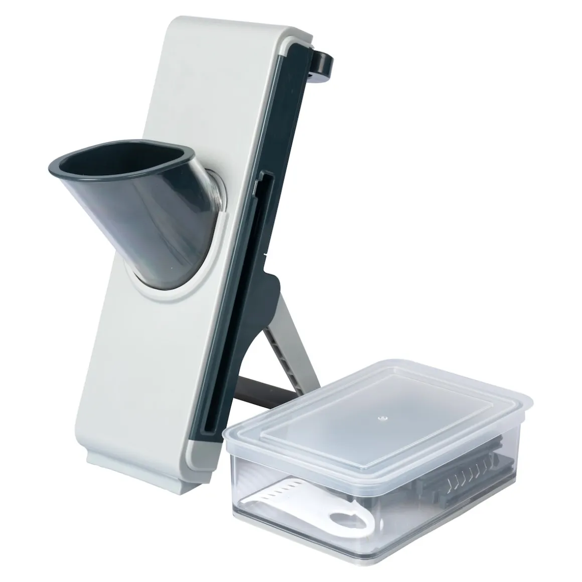 Für schnelle und gleichmäßige Ergebnisse: Mit diesem innovativen Küchenhelfer zaubern Sie dekorative Gemüsescheiben oder Julienne-Stifte mühelos und in Rekordzeit! Ihre Finger kommen durch den genialen „Push“-Mechanismus nie mit der Klinge in Berührung: Einfach Klinge der Wahl seitlich einstecken und per Druckhebel auf der Rückseite absolut sicher bedienen. Praktisch: In dem transparenten Behälter wird alles sicher aufgefangen.