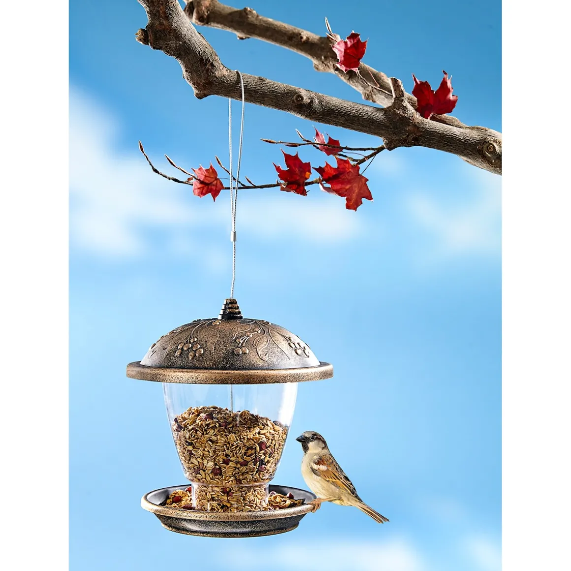 Sie lieben Tiere und wollen die Vögel in Ihrem Garten gerne gut versorgt sehen – Sie schätzen aber auch eine besondere Dekoration? Dann ist diese ebenso praktische wie bezaubernde Futterstelle im Antik-Look genau richtig für Sie. Mit Drahtseil zum Aufhängen.