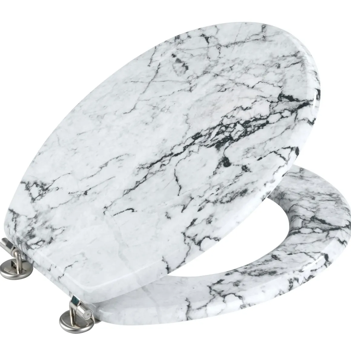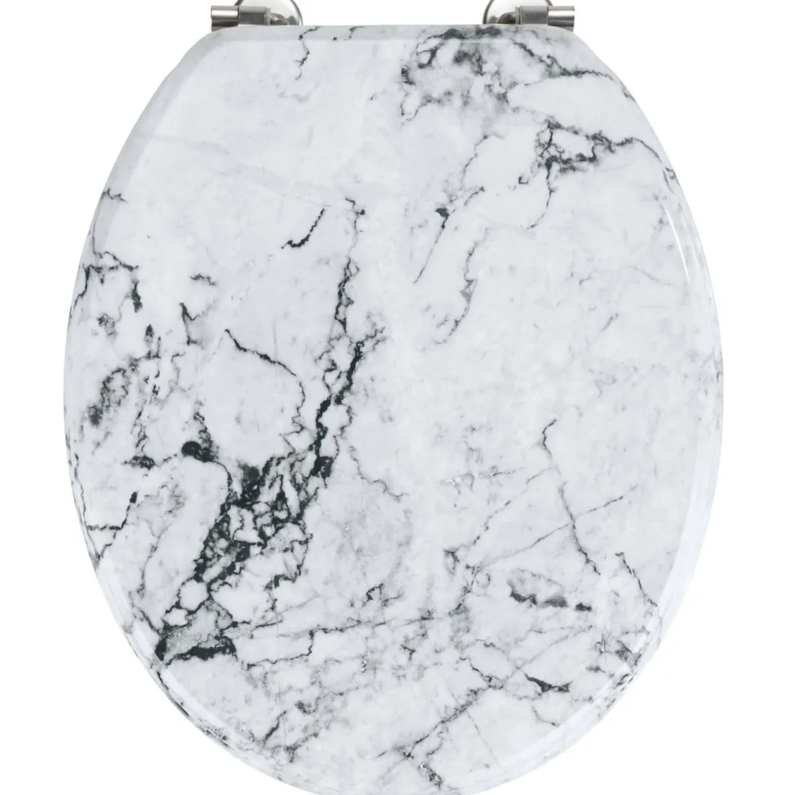 Die edle und sehr filigran gezeichnete Marmor-Optik wertet jedes Bad und Gäste-WC auf und verleiht ihm ein modernes Ambiente. Schwere, strapazierfähige MDF-Qualität. Durch die aufwendige Mehrfachlackierung und -folierung ist die Oberfläche des Toilettensitzes optimal gegen Feuchtigkeit geschützt und ermöglicht eine leichte und hygienische Reinigung. Bequemer Sitzkomfort. Mit hochwertigen Edelstahl-Scharnieren. Passend für alle handelsüblichen Toiletten. Inklusive Befestigungsmaterial und Wandpuffer.