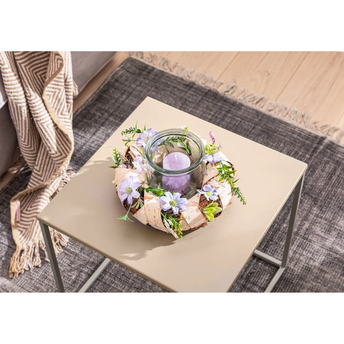 Was gibt es Schöneres, als am Abend das behagliche Flackern einer Kerze zu genießen? Mit diesem liebevoll gestalteten Blumenkranz schaffen Sie den perfekten Rahmen für das Windlicht. Ob drinnen oder draußen – das sommerliche Arrangement schafft das ganze Jahr über eine gemütliche Wohlfühlatmosphäre!